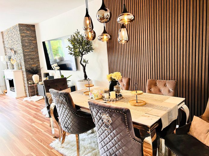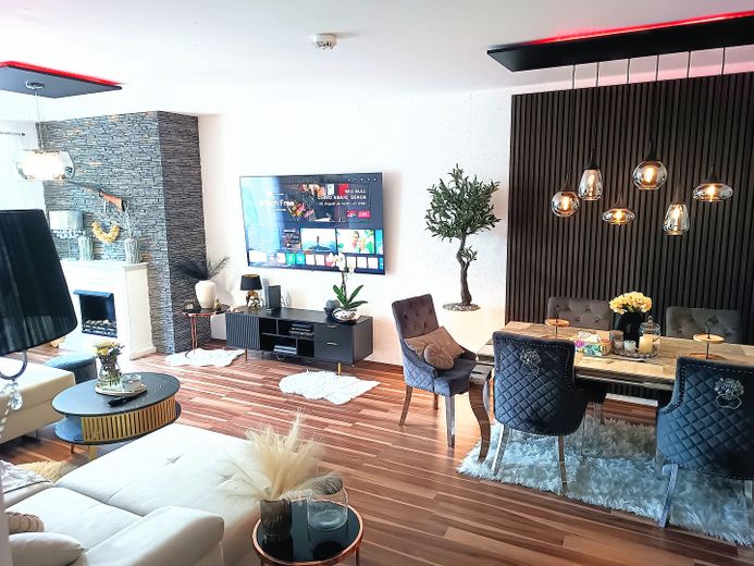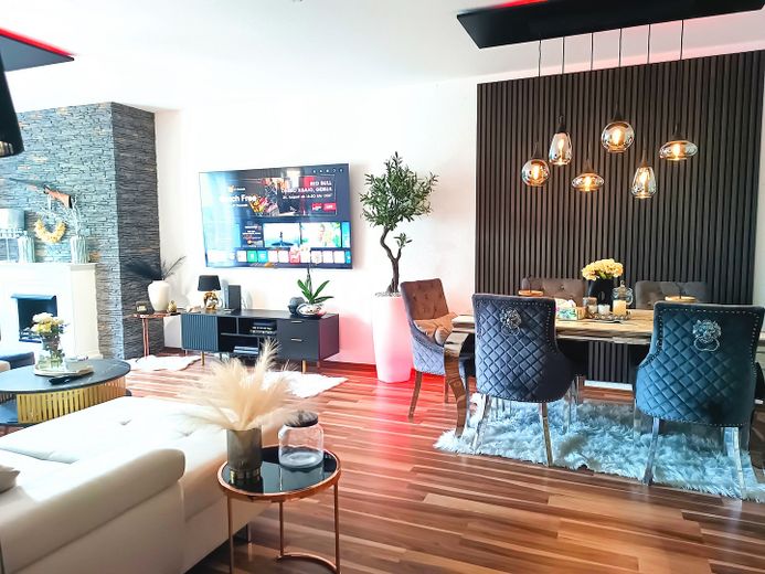 2021: abgehängte Decken mit LED-Beleuchtung, Kaminportal im Wohnzimmer