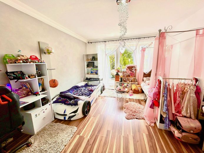 Zimmer 1 (ca. 20 m²): Kinder- oder Schlafzimmer, direkter Zugang zur Südterrasse & Garten, flexible Elektroinstallation, Schalter direkt am Bett