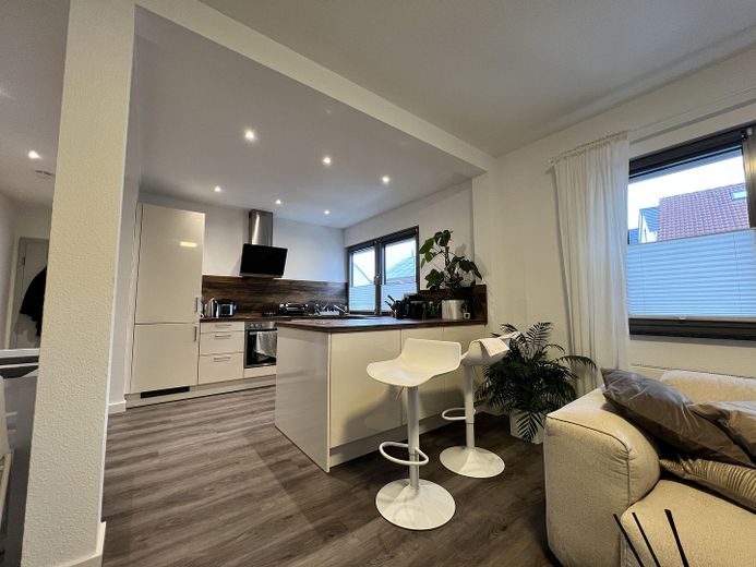 Die Küche, der Essbereich und das Wohnzimmer sind offen gestaltet und werden als ein halbes Zimmer erfasst.