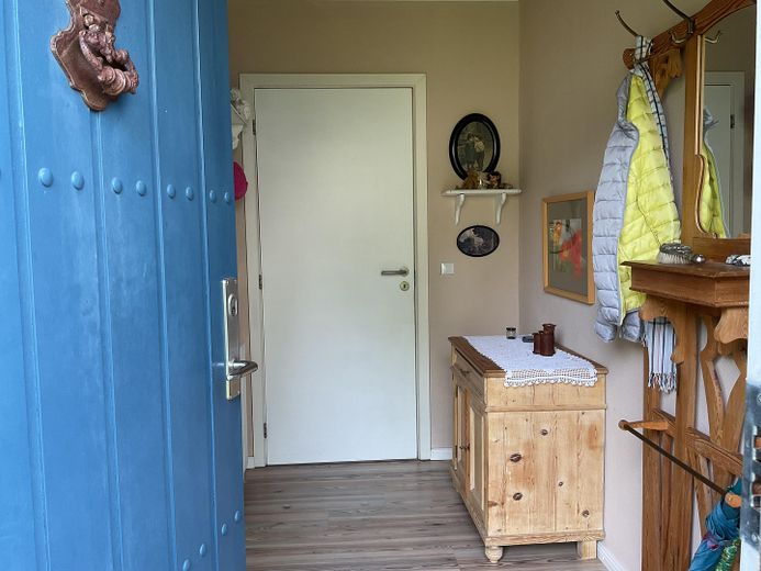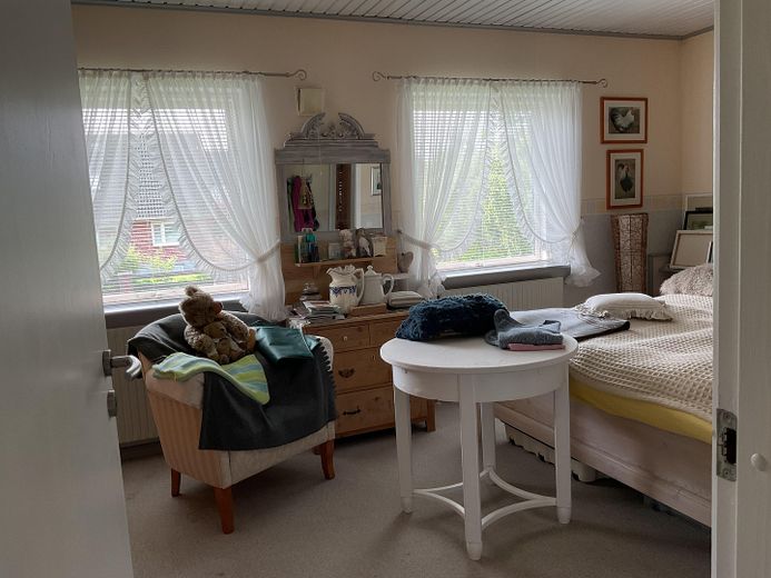 Ergänzt wird das Raumangebot durch ein Büro, das sich auch als Schlafzimmer nutzen ließe sowie ein weiteres separates Schlafzimmer, welche Beide durch den gemeinsamen Flur erreichbar sind. Hier sind außerdem das große Badezimmer, der Hauswirtschaftsraum und die Holztreppe für das Obergeschoss zu erreichen.