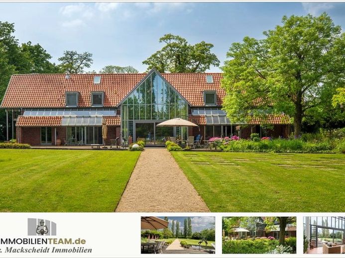 Hier wird auf üppigen ca. 15.000 m² ländliche Architektur meisterhaft inszeniert: Luxuriöse ca. 500 m² Wohn-Nutzfläche warten unter einem genial konzipierten Kreuzgiebeldach.