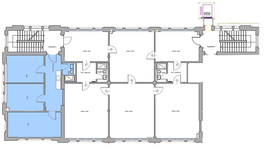 9 Zimmer, 3 Eingänge, 3 Bäder + Küche.