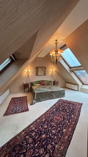 Das Obergeschoss von ca 141m² bietet 3 helle Schlafzimmer, darunter eines mit begehbarem Kleiderschrank und ein weiteres kleineres Zimmer, das man ideal als Büro oder Atelier nutzen könnte, sowie ein Vollbad mit zwei Waschtischen und einem Bidet im klassischen Stil der 70-er Jahre. Damit stehen vielfältige Nutzungsmöglichkeiten für unterschiedliche Familienbedürfnisse zur Verfügung.