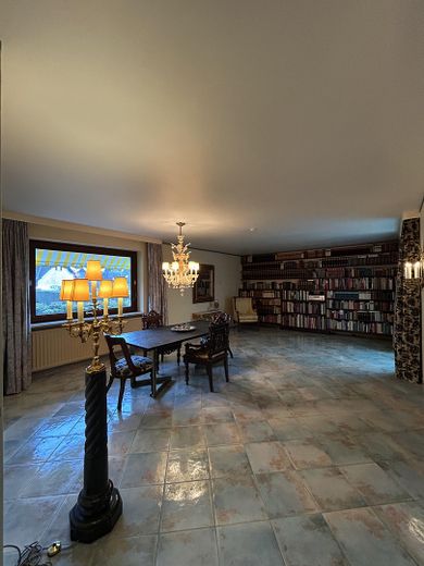Wohnzimmer mit einem offenen Travertin-Kamin für entspannte Familienmomente, einer großen Bibliothek, sowie einem offenen Esszimmer, mit direkter Verbindung zur Küche. Ebenso geht es von dort zum Wintergarten von ca 25m² mit einem harmonischer Übergang auf die Terrasse und in den Garten. Das Erdgeschoss hat des weiteren auch ein separates Gästezimmer. Angrenzend befindet sich eine