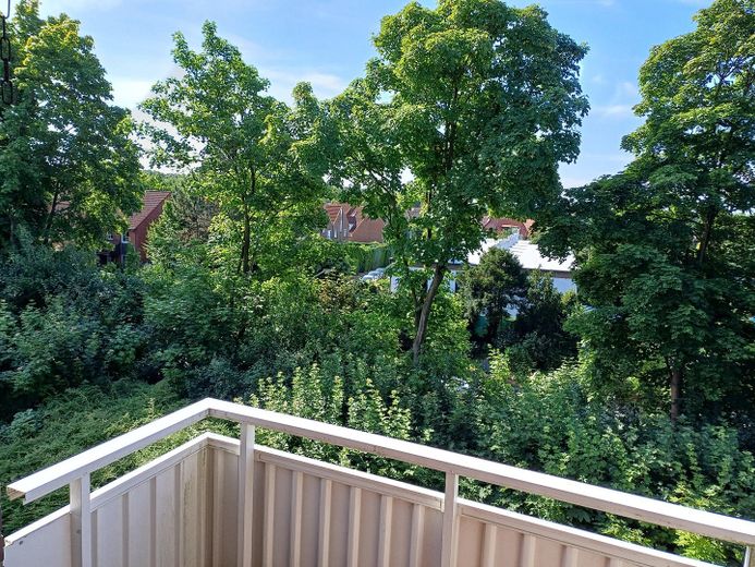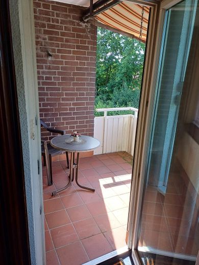 Vom Wohnzimmer betritt man den Balkon, der mit einer Markise ausgestattet und nach Süden ausgerichtet ist.