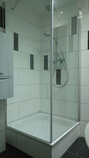 Das Badezimmer präsentiert sich modern und funktional und ist mit einer Dusche ausgestattet. Die Dachgeschosswohnung ist zudem gedämmt und verfügt über hochwertige Velux-Dachfenster, die für eine hervorragende Lichtdurchflutung und ein angenehmes Raumklima sorgen.