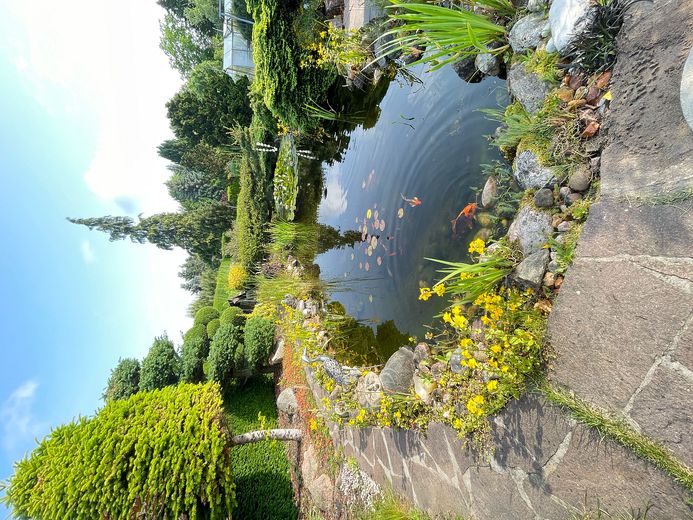 Der große Garten mit Teich und pflegeleichten Laub- und Nadelgehölzen bietet viel Platz zur Entspannung und freien Gestaltung.