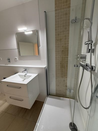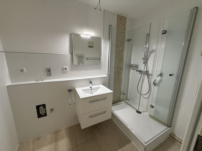 Ein echtes Highlight ist das hochwertige Badezimmer (2021 renoviert) mit seiner eleganten, großräumigen und bodengleichen Dusche – stilvoll, modern und sehr komfortabel. Auch für die Waschmaschine bleibt genug Platz und der hochwertige Waschtisch sorgt für Stauraum in zwei Schubladen.
