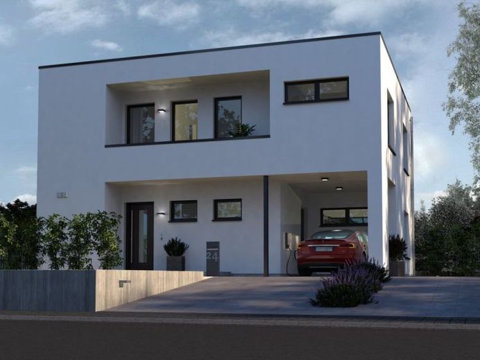 Die geradlinige Struktur der zweigeschossigen Flachdachvilla wird durch die Fassadenrücksprünge und die asymmetrische Gestaltung architektonisch ergänzt. Clever und vor allem für kleine Grundstücke geeignet: der integrierte Carport. Schlicht, hell und komfortabel geht es auch im Innenbereich weiter. Das Erdgeschoss ist klar in Nutz- sowie Wohn- und Essbereich mit offener Küche unterteilt. Die halbgewendelte Treppe führt in die obere Etage. Hier ist das Elternzimmer mit großem Bad und Zugang zur eigenen Loggia vom Areal der Kinder mit Dusche/WC abgegrenzt. Die Bereiche werden durch die lichte Galerie mit Zugang zu einer weiteren Loggia verbunden. Hier fühlt man sich zu Hause.