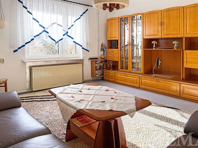 Im Erdgeschoss befinden sich ein großer Wohnbereich, ein Esszimmer, ein weiteres Zimmer, eine Küche mit Einbauküche und Speisekammer, ein Badezimmer mit Dusche, eine Hauseingangsveranda sowie eine Diele. In der Diele führt eine Massivholztreppe in das Dachgeschoss und in den Vollkeller. Die Wohnfläche im Erdgeschoss beträgt ca. 88 m².