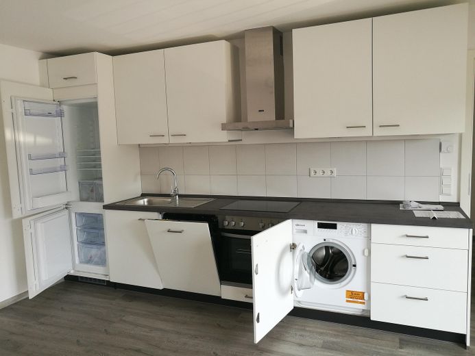 -eine offene Küche mit integrierter Einbauküche inklusive -Waschmaschine
