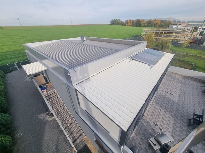 Stahlkonstruktion mit integrierten Stahlmodulen, errichtet auf einem klassischen Betonfundament. Die Bauweise kombiniert bewährte Industriematerialien mit einem funktionalen, durchdachten Design – geeignet für Wohn- oder Gewerbenutzung.