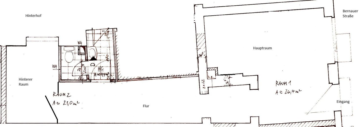 - Einem zweiten Raum im hinteren Bereich mit ca. 12 qm. Dieser Raum besitzt auch einen Wasser- bzw. Küchenanschluss.
