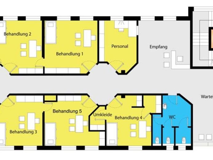 Auf der Gesamtfläche von ca. 240 m² finden Sie neben einem großzügigen Empfangs- und Wartebereich zwei Sprechzimmer, fünf Behandlungszimmer, einen Personalraum, ein kleines Lager sowie die sanitären Anlagen. Der Personalraum ist mit einer Pantryküche ausgestattet. Die Einheit ist vorwiegend mit PVC-Belag ausgestattet und die sanitären Räume sind gefliest.