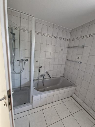 Das große Tageslichtbad mit Dusche und Badewanne ist gefliest, während Sie sich dank des Waschkellers im Kellerbereich den Platz für eine Waschmaschine im Bad sparen.
