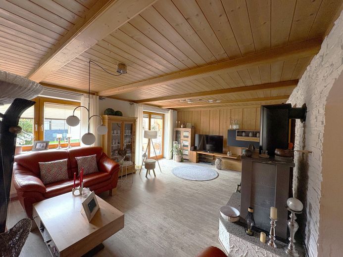 Im Erdgeschoss erwartet Sie ein offen gestalteter Küchen-, Wohn- und Essbereich mit Schwedenofen und direktem Zugang zur sonnigen überdachten Südterrasse. Der Eingangsbereich bietet Platz für eine kleine Garderobe sowie ein Gäste-WC.