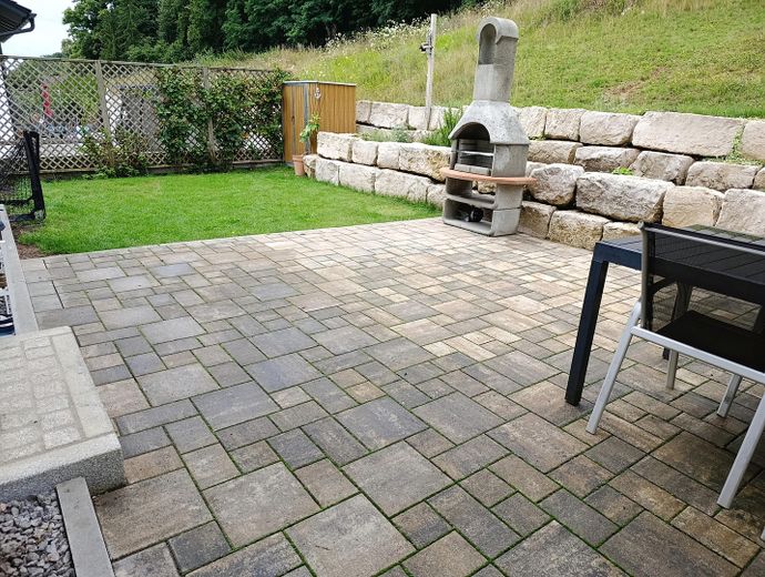 Die Terrasse grenzt an einen Wald, der keiner Bebauung unterliegt.