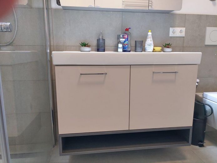 + ein Bad mit Doppelwaschbecken, Spiegelschrank, Badewanne und WC