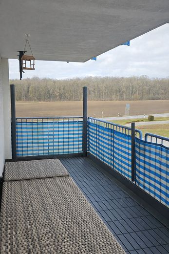 Der großzügige Balkon schafft zusätzlichen Wohnraum im Freien und bietet ausreichend Platz für Sitzmöbel.