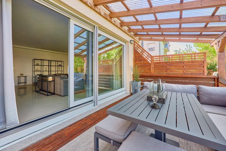 Das großzügige, ca. 50 m² helle Wohnzimmer im Erdgeschoss öffnet sich über eine bodentiefe Hebeschiebetür direkt zur Terrasse mit Treppenabgang in den weitläufigen Garten. Die offene Einbauküche mit Kochinsel (Neupreis ca. 30.000 €) setzt ein echtes Highlight. Das Badezimmer wurde 2020 vollständig modernisiert — mit Doppelwaschbecken, Badewanne und Unterputzarmaturen auf höchstem Niveau. Im Kellergeschoss befinden sich drei weitere Zimmer mit hochwertigen Vinylböden und vollwertigem Tageslicht.