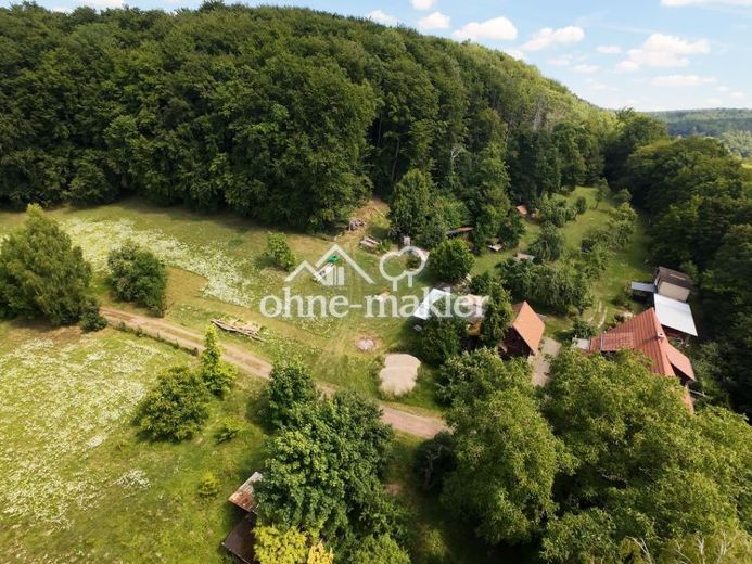 Der Wald, überwiegend Buchenwald mit rund 120 Jahre alten Bäumen, bietet nicht nur Ruhe und Schutz, sondern auch die Möglichkeit mit eigenem Holz kostenlos zu heizen oder Holz zu verkaufen. Die Wiese um das Haus, teilweise mit alten Apfelbäumen bestanden, ist ideal für landwirtschaftliche Nutzung, Tierhaltung, Garten- oder Obstbau.