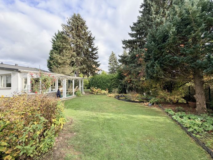 Der liebevoll angelegte Garten ist ein echtes Schmuckstück: Mit seinem gepflegten Rasen, gewachsenen Büschen und einem kleinen Teich lädt er zum Verweilen ein und bietet zugleich viel Platz für individuelle Gestaltungsideen.