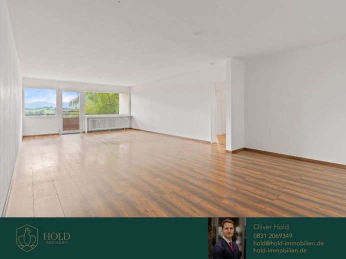 Herzstück ist das helle Wohn- und Esszimmer mit Zugang zur Ostloggia mit Blick auf Nesselwang und die Berge.