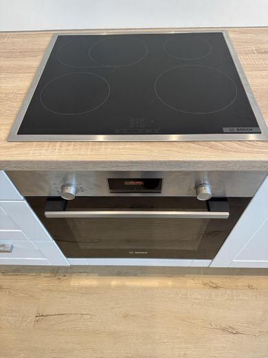 Die Küche ist mit hochwertigen Geräten wie Bosch Induktionsherdplatte, Bosch Backofen, Spülmaschine von Goronje ausgestattet. Ein Dunstabzug wird noch angebracht.