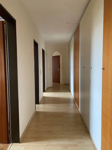 Im lang geschnittenen Flur befindet sich ein großzügiger, maßgefertigter 10-türiger Einbauschrank, der außergewöhnlich viel Stauraum bietet.
