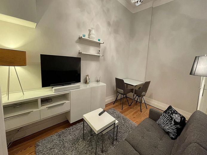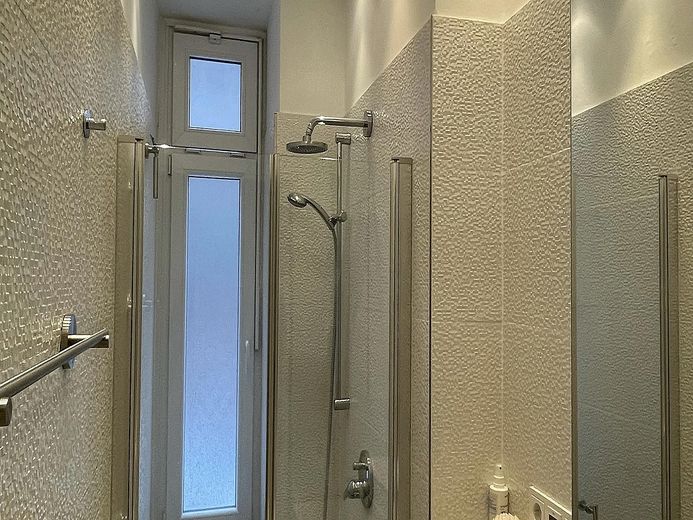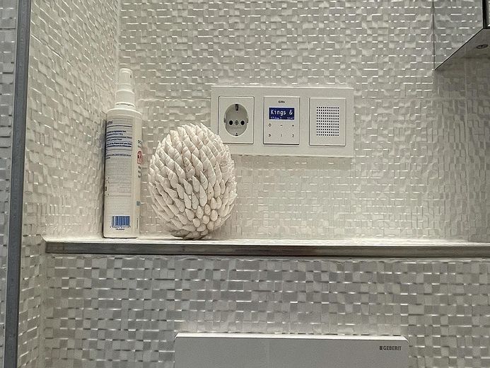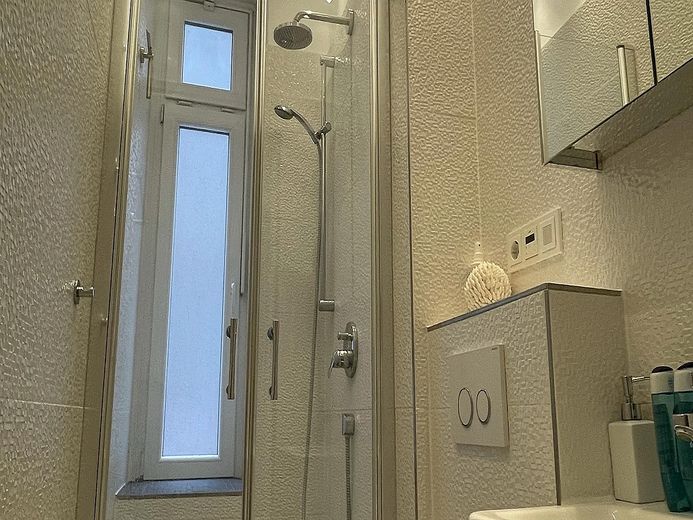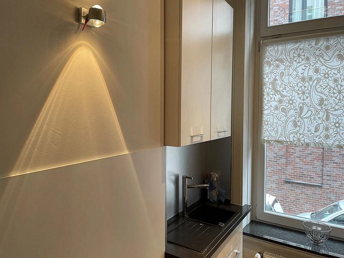 Das Schlafzimmer hat ein komfortables Bett (160x200 cm) sowie einen großen Kleiderschrank. Ein kleines helles schickes Badezimmer mit Regendusche und großen Spiegelschrank mit vielen Ablageflächen. Alle Räume sind dimmbar bis auf das Schlafzimmer.