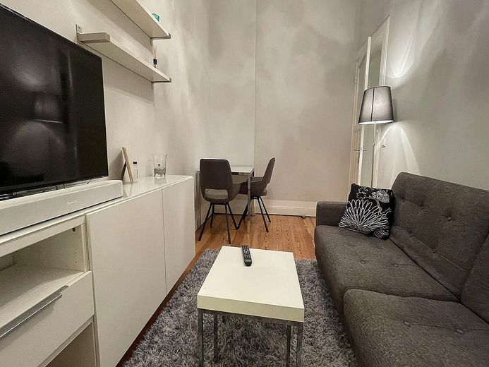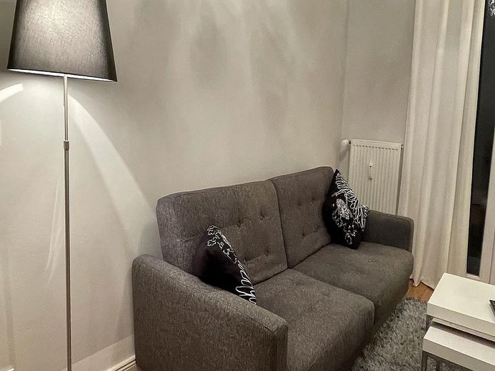 Das schöne und helle Wohnzimmer ist mit einem gemütlichen, großen Schlafsofa, einem großen Schrank sowie einem Flat-TV (Kabel-Anschluss) eingerichtet.