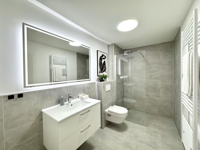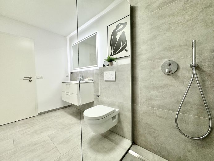 Das Badezimmer wurde vollständig erneuert: bodengleiche Regendusche, moderne Armaturen und hochwertige Materialien schaffen ein harmonisches Ambiente. Der barrierearme Zugang unterstreicht den hohen Wohnkomfort.