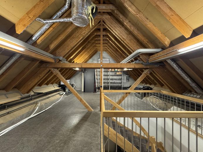Die Flächen gliedern sich in einen großen Besprechungs-/Schulungsraum, mehrere Büros, Archiv-/Lagerbereiche, eine hochwertige Einbauküche im Atrium und getrennte Sanitäranlagen. Durch den nahezu stützenfreien Grundriss sind Grundrissänderungen unkompliziert möglich.