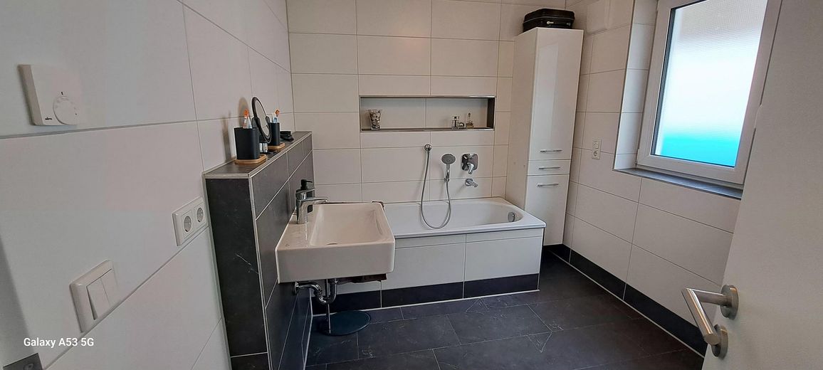 Hauptbadezimmer mit Badewanne, WC und Waschbecken