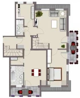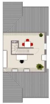 Die 4-Zimmer-Maisonettewohnung im Dach besteht aus dem dem Wohnzimmer mit Treppe nach oben, dem von diesem aus erreichbaren Schlafzimmer, der Küche, einem Zwischenzimmer, das zum Badezimmer führt, ein weiteres Badezimmer, dem Flur und eine Etage höher einen großen Dachraum. Ein Balkon ist vom Wohn- und dem Schlafzimmer aus zugänglich, der 2. Balkon vom Zwischenzimmer aus.