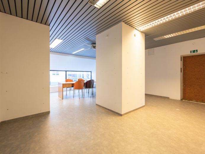 Die Fläche teilt sich in einen großzügigen, hellen Hauptraum im vorderen Bereich, sowie zwei separate Räume im hinteren Teil der Einheit.