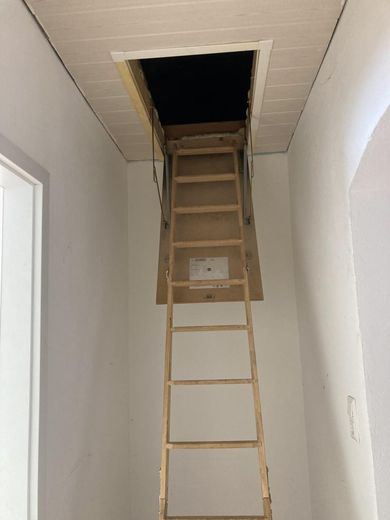 -Der Dachboden wurde 2022 auf ca. 30 m² mit Holzspanplatten verkleidet, um diesen als Lager für Kleidung, Dekoration etc. zu nutzen.