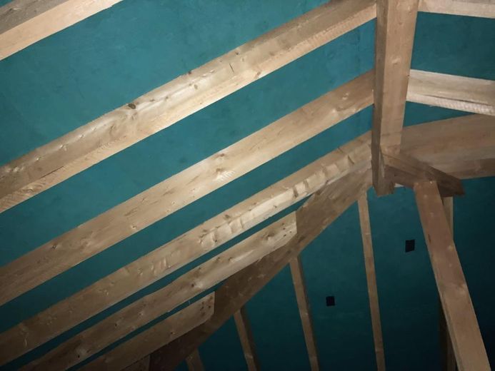 -Die Holzsparren außen sollten geschliffen, lackiert und lasiert werden.
