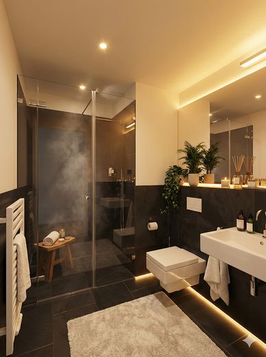 Bad & Wellness: Das luxuriöse Badezimmer verfügt über hochwertige Armaturen, eine großzügige, ebenerdige Dusche und elegantes Feinsteinzeug. Ein Waschtrockner ist bereits integriert und steht Ihnen in der Wohnung zur Verfügung.