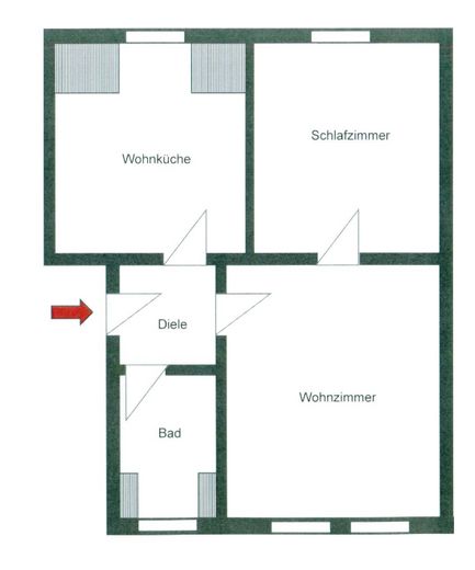 Die Wohnung erstreckt sich über 55 m² aufgeteilt auf Schlafzimmer, Wohnzimmer, Küche, Bad und Diele.