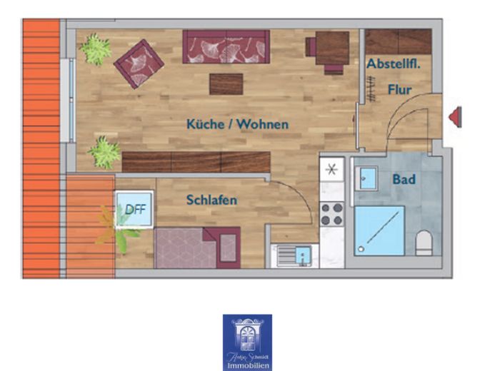 Diese gemütliche 2-Zimmerwohnung befindet sich im Dachgeschoss. Im hellen großzügigen Wohnbereich ist die offene Küche mit moderner EBK integriert. Das Schlafzimmer verfügt über einen optimalen Zuschnitt. Das moderne Bad mit einer ebenerdiger Dusche und einem Handtuchheizkörper ist exklusiv ausgestattet. Der Anschluss für Ihre Waschmaschine sowie ein zusätzlicher Abstellraum zur Wohnung befinden sich im Treppenhaus.