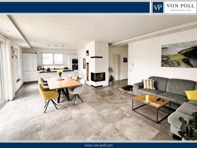 Edle Bodenbeläge, große Fensterfronten und innovative Haustechnik sorgen für hohen Wohnkomfort. Die Photovoltaikanlage (2021, 9,66 kWp) trägt zu niedrigen Energiekosten bei. Eine Doppelgarage sowie Außenstellplätze runden das Angebot ab.