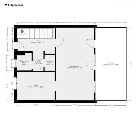 Im Erdgeschoss empfängt Sie ein heller Wohn- und Essbereich mit direktem Zugang zur südwestlich ausgerichteten Terrasse. Die separate Küche ist vollständig ausgestattet und im Kaufpreis enthalten. Ein Bad mit Dusche, ein praktischer Abstellraum und der Flur mit der einladenden Holztreppe komplettieren das Erdgeschoss.