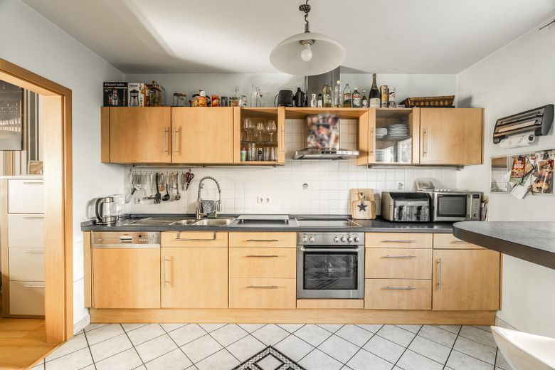 Die Einbauküche mit Holzfronten, Backofen, Ceranfeld, Spüle und ausreichend Stauraum ist im Kaufpreis inbegriffen.