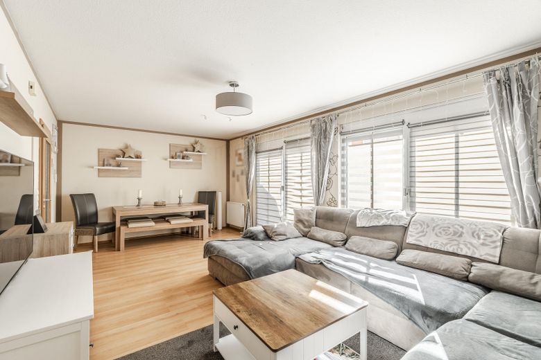 Die Fenster sind durchgehend zweifach verglast mit Kunststoffrahmen. Außenjalousien, die teilweise elektrisch bedient werden, bieten Sonnen- und Sichtschutz.