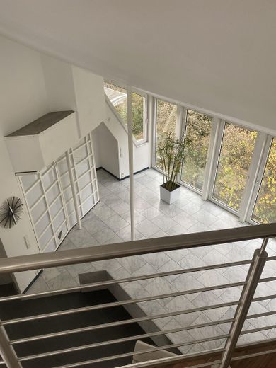 Über das charmante Treppenhaus erreichen Sie die im 3. Obergeschoss eines denkmalgeschützten Altbaus gelegene Mansarde-Wohnung. Die loftartige, hexagonale Raumplanung und eine offene Galerie schaffen ein einzigartiges Raumgefühl. Große bodentiefe Fenster mit französischen Balkonen erlauben ungehinderte Sicht ins Grüne.