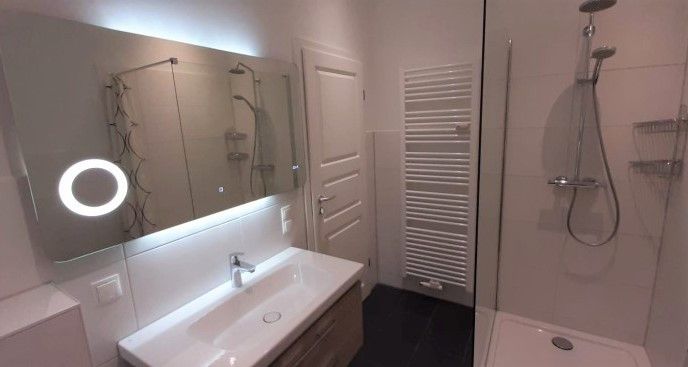 Das Bad ist modern und elegant gestaltet und ist mit Dusche, einem Handtuchheizkörper, einem Waschtisch mit Unterschrank sowie einer Echtglasdusche ausgestattet.