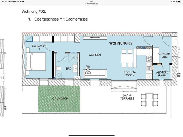Die Wohnung befindet sich in einem gepflegten Zustand. Die Terrasse ist mit Kunstrasen ausgestattet. Die Wände sind weiß gestrichen und modern gehalten.