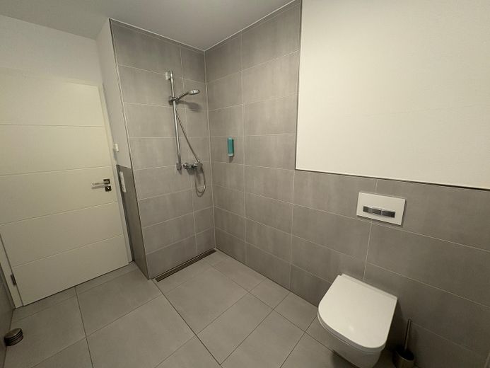 Des Weiteren befindet sich im Erdgeschoss das Badezimmer mit WC, Dusche und Waschbecken und der Technikraum mit Luft-Wasserwärmepumpe mit Fußbodenheizung (Stiebel Eltron LWZ).