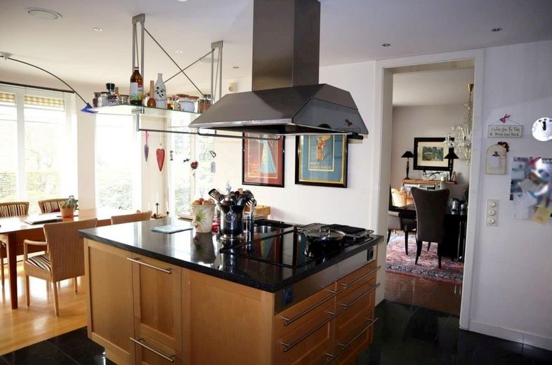 Die moderne Küche mit Kochinsel bietet ideale Voraussetzungen für kulinarische Erlebnisse. Ein separates Büro mit Blick ins Grüne schafft einen ruhigen Rückzugsort für konzentriertes Arbeiten.